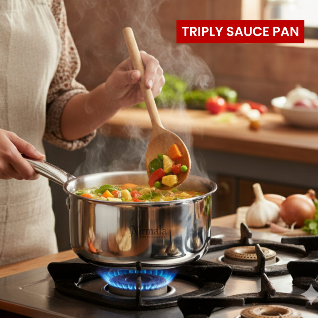 Upgrade your kitchen with the Nirmala Triply Sauce Pan – crafted with triple-layer technology for quick, even heating and healthier cooking. Ideal for boiling, simmering, and making sauces, it’s durable, easy to clean, and works perfectly on gas and induction stoves. Designed for performance, built for everyday use.